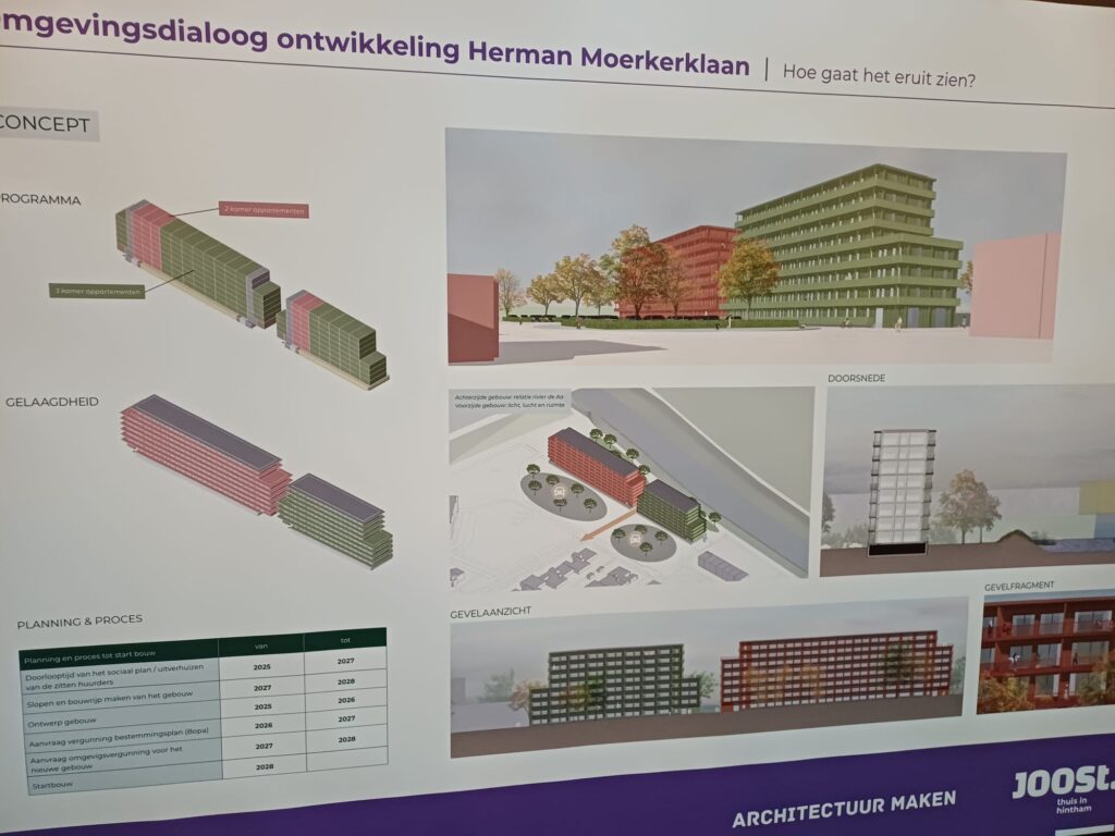 Het proces verloopt soepel, waarbij de huidige bewoners van de flat aan de Herman Moerkerklaan zeer goed deelnemen aan de verhuizing. Velen hebben ook al een andere woning. JOOST coördineert de verplaatsing en de tijdelijke bewoning, waarbij ook jongeren betrokken zijn die zorgen voor een nieuwe positieve dynamiek met de oudere bewoners.